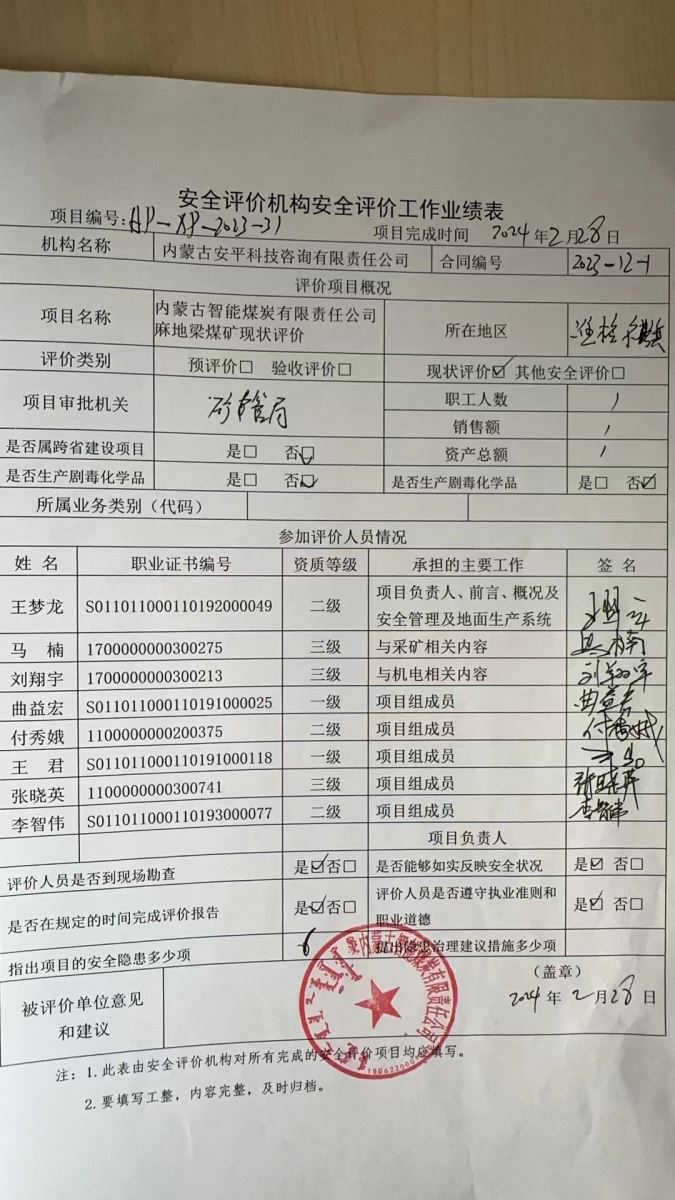 為辦理延續(xù)安全生產(chǎn)許可證,委托內(nèi)蒙古安平科技咨詢有限責(zé)任公司對煤礦進行安全現(xiàn)狀評價。根據(jù)《中華人民共和國安全生產(chǎn)法》、《安全生產(chǎn)許可證條例》(國務(wù)院令第397號)、《煤礦企業(yè)安全生產(chǎn)許可證實施辦法》(國家安全生產(chǎn)監(jiān)督管理總局令第86號,國家安全生產(chǎn)監(jiān)督管理總局第89號令修訂)以及其他相關(guān)法律法規(guī)的規(guī)定,受麻地梁委托,我公司承擔(dān)該礦安全現(xiàn)狀評價工作。